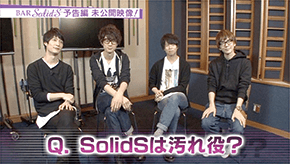 SolidSのメンバーを演じる江口拓也、斉藤壮馬、花江夏樹、梅原裕一郎が、お酒を飲みながら赤裸々トーク。メンバーおすすめのカクテルを紹介するほか、ほろ酔いテンションで、恋愛や音楽について熱く語ります。